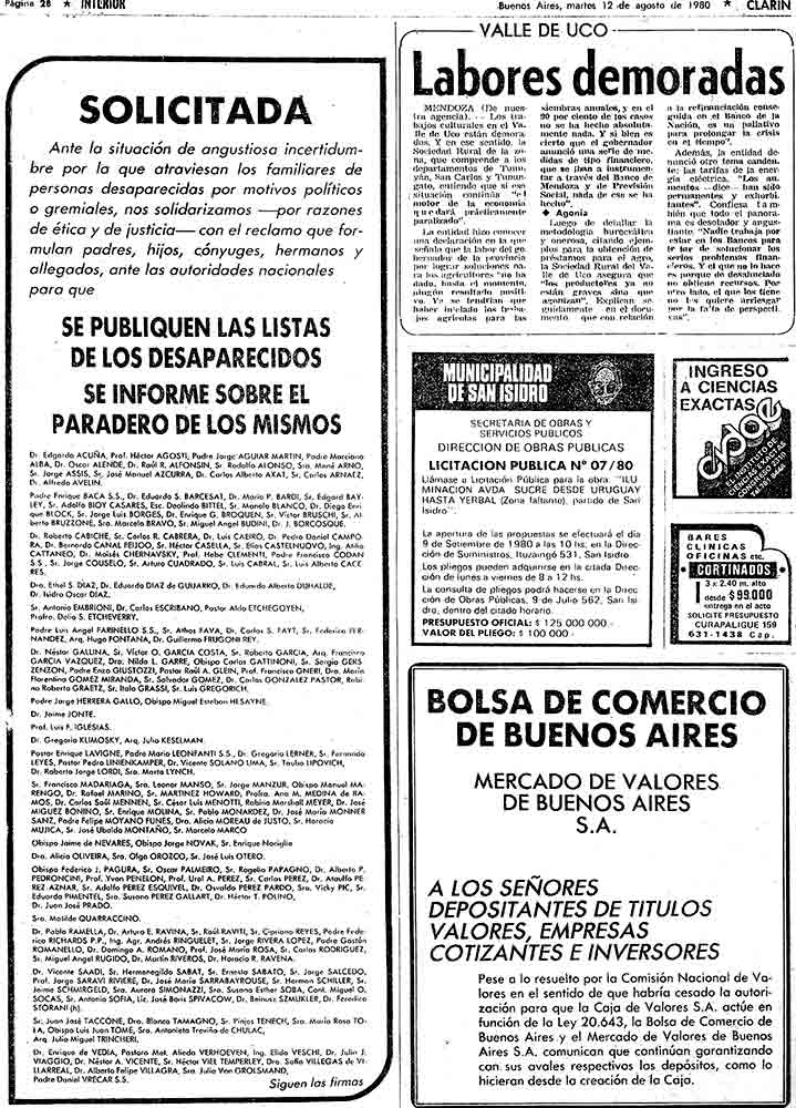 Familiares de desaparecidos y detenidos por razones políticas publican esta solicitada, reclamando se den a conocer las listas de los desaparecidos, con firmas de personas relevantes de todos los sectores del país. Entre ellas, el doctor Raúl Alfonsín. Fecha: 12/08/1980